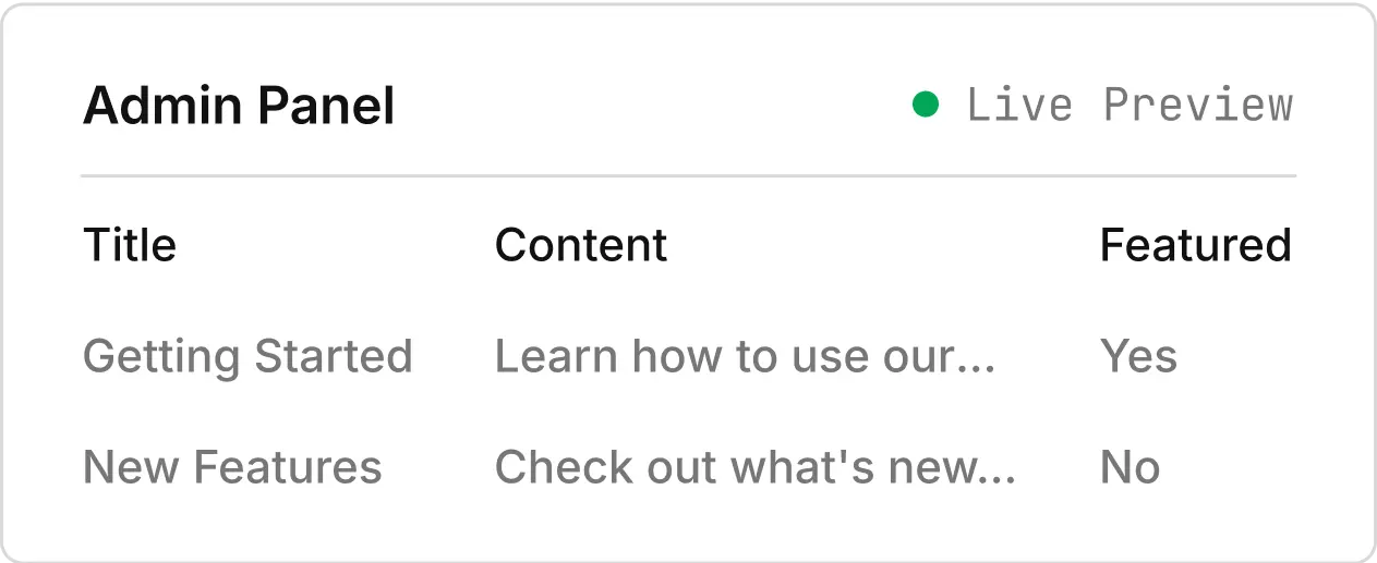 Live Feed, SEO Issues, Page Status, Settings, Downloads, Content viewer, Newsletter, and Premium — all in a responsive card grid with expand-to-overlay interactions.